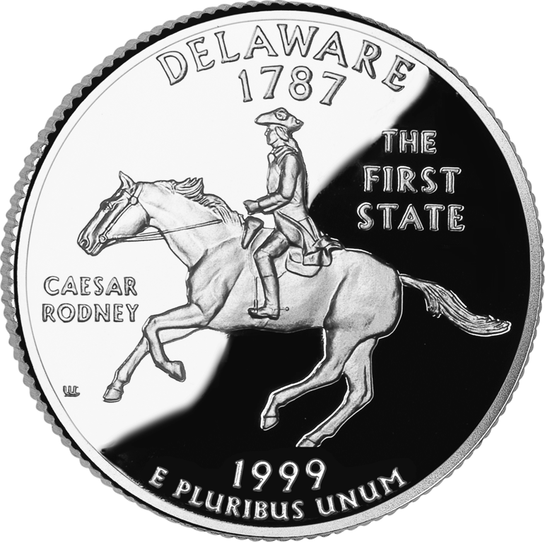 The Delaware State Quarter features Caesar Rodney (October 7, 1728 – June 26, 1784) — famous lawyer, politician, and officer during the Revolutionary and French-Indian Wars — on horseback wearing a three pointed hat.