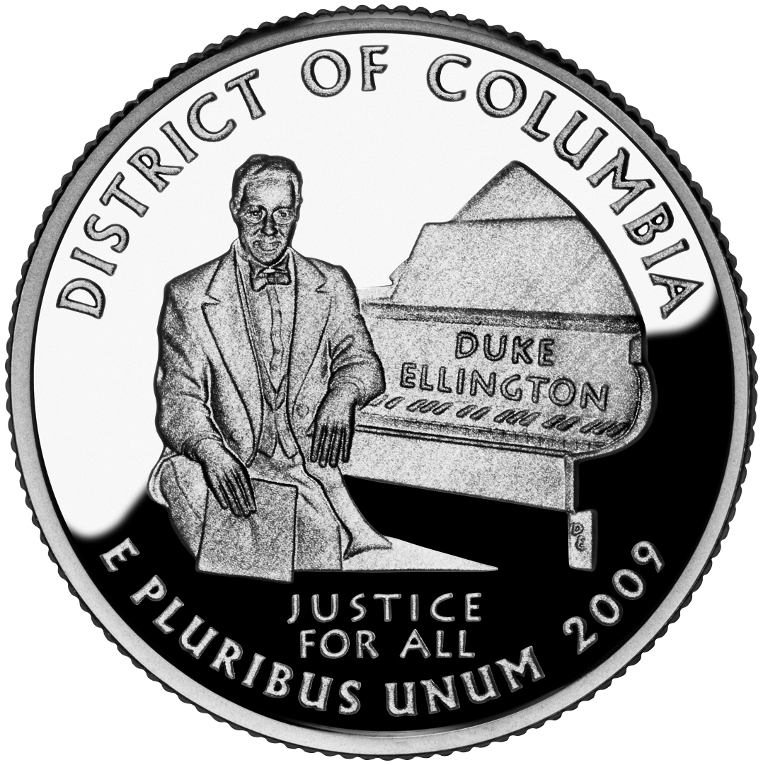 Washington D.C.'s quarter features an image of Duke Ellington, famous composer and pianist, seated at a grand piano.