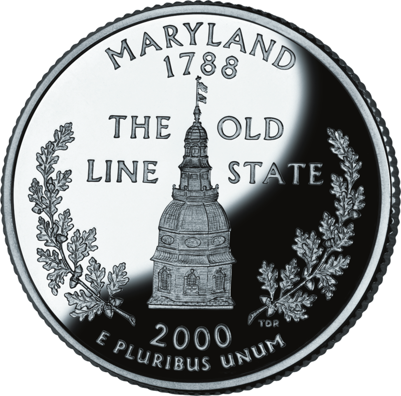 Maryland, "The Old Line State," proudly displays its caption front and center. The caption surrounds a depiction of the Maryland State House. Around the sides of the quarter are White Oak branches (state tree). Maryland is called The Old Line State because the Mason Dixon line is the state\'s northern boundary.
