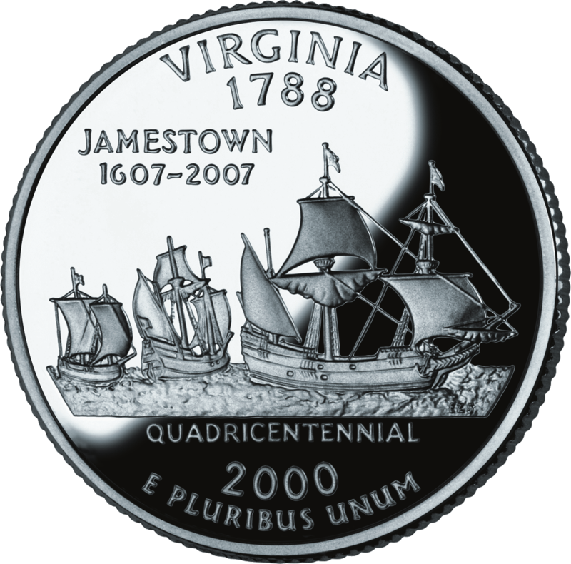 The Virginia State Quarter shows the three ships that first landed in Virginia in 1607. The ships are called "Susan Constant," "Godspeed," and "Discovery."